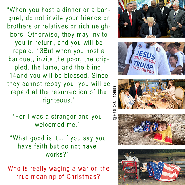 Think about that for a moment… The “Christian Party” is running up to the celebration of the birth of their savior – the one whose family were brown-skinned refugees looking for shelter when he was born, and who spent his adult life telling his followers, “go, sell what you own, and give the money to the poor, and you will have treasure in heaven” and “when you give a banquet, invite the poor, the crippled, the lame, and the blind. And you will be blessed, because they cannot repay you, for you will be repaid at the resurrection of the righteous.” – by spending billions of dollars to keep out brown-skinned refugees with children and by making those in need “earn” the help we give them because our country can’t afford to feed the poor.