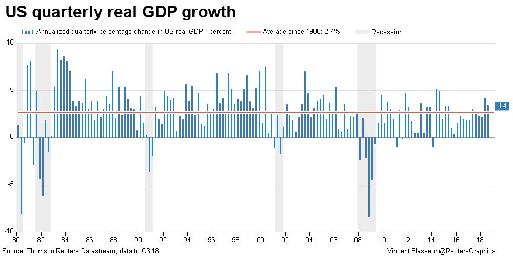 I won’t add much beyond this chart of quarterly GDP since Reagan. Even a “mentally deranged dotard” can see that Trump’s economic performance is BELOW AVERAGE compared to the last 40 years of economic growth. And his best quarter would only have been Obama’s 5th best quarter.