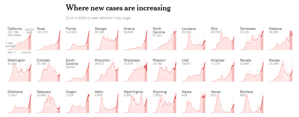 85% of red states are spiking Covid-19 cases and 77% of blue states are flat or declining. Why? It is driven by which officials and news you listen to. If you believe Trump and Fox, you're more likely to die today.